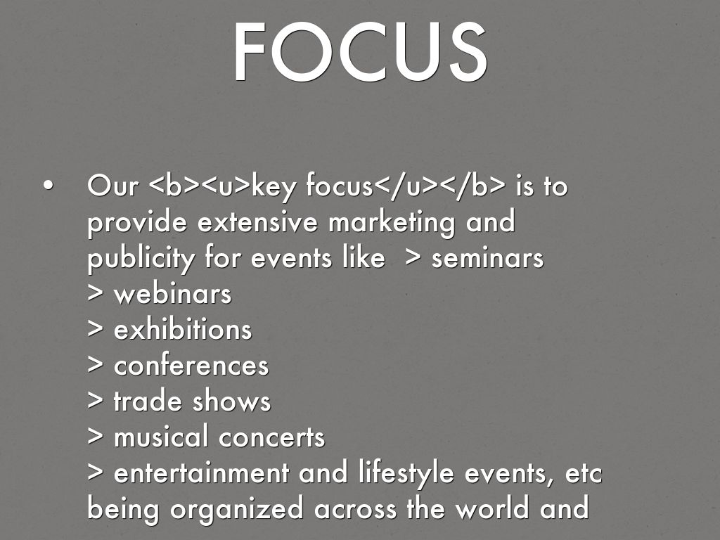 > entertainment and lifestyle events, etc being organized across the world and promote them in highly influential manner using the latest marketing techniques.