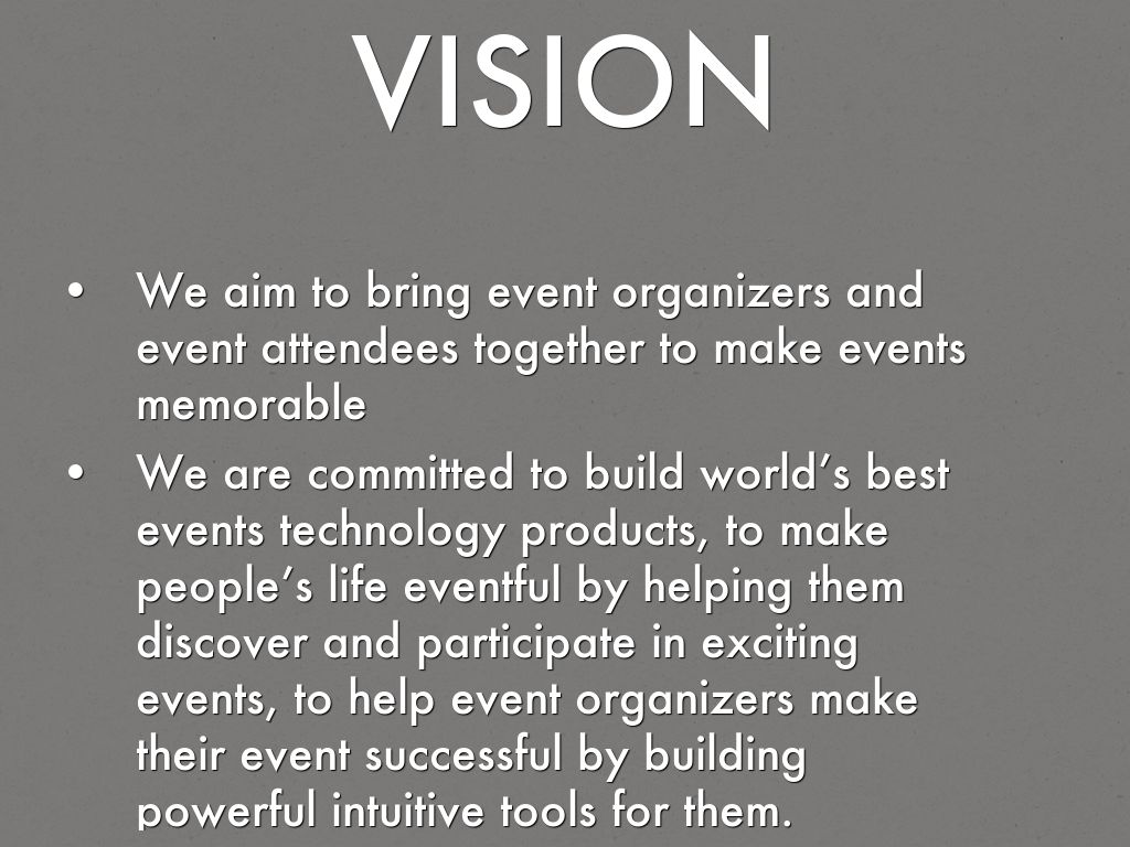 We are committed to build world’s best events technology products, to make people’s life eventful by helping them discover and participate in exciting events, to help event organizers make their event successful by building powerful intuitive tools for them.