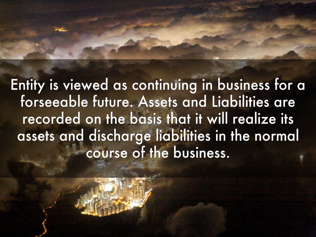 Entity is viewed as continuing in business for a forseeable future. Assets and Liabilities are recorded on the basis that it will realize its assets and discharge liabilities in the normal course of the business.