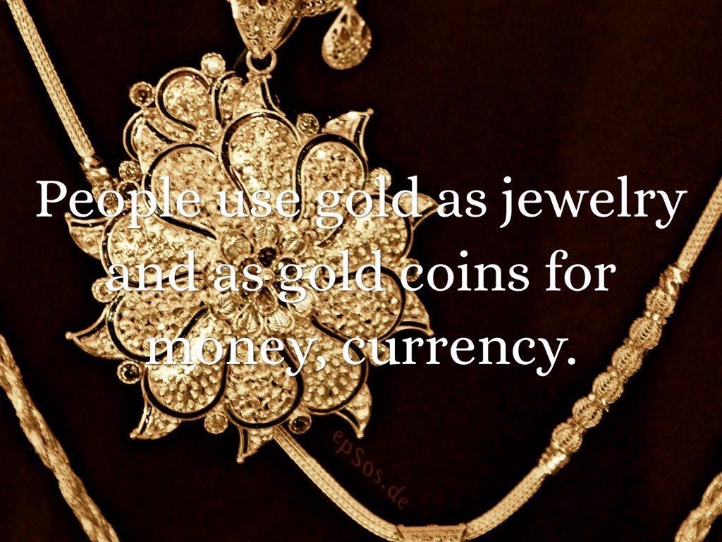 People use gold as jewelry and as gold coins for money, currency.