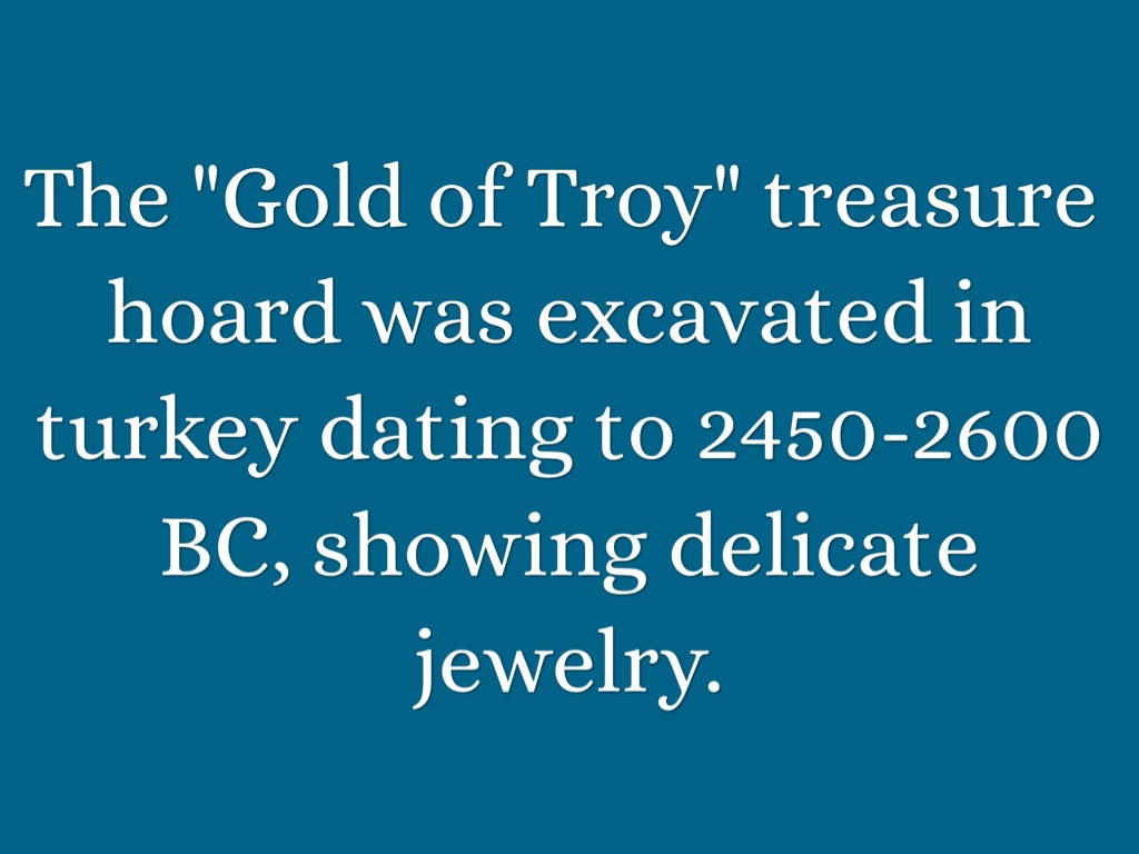 The "Gold of Troy" treasure hoard was excavated in turkey dating to 2450-2600 BC, showing delicate jewelry.