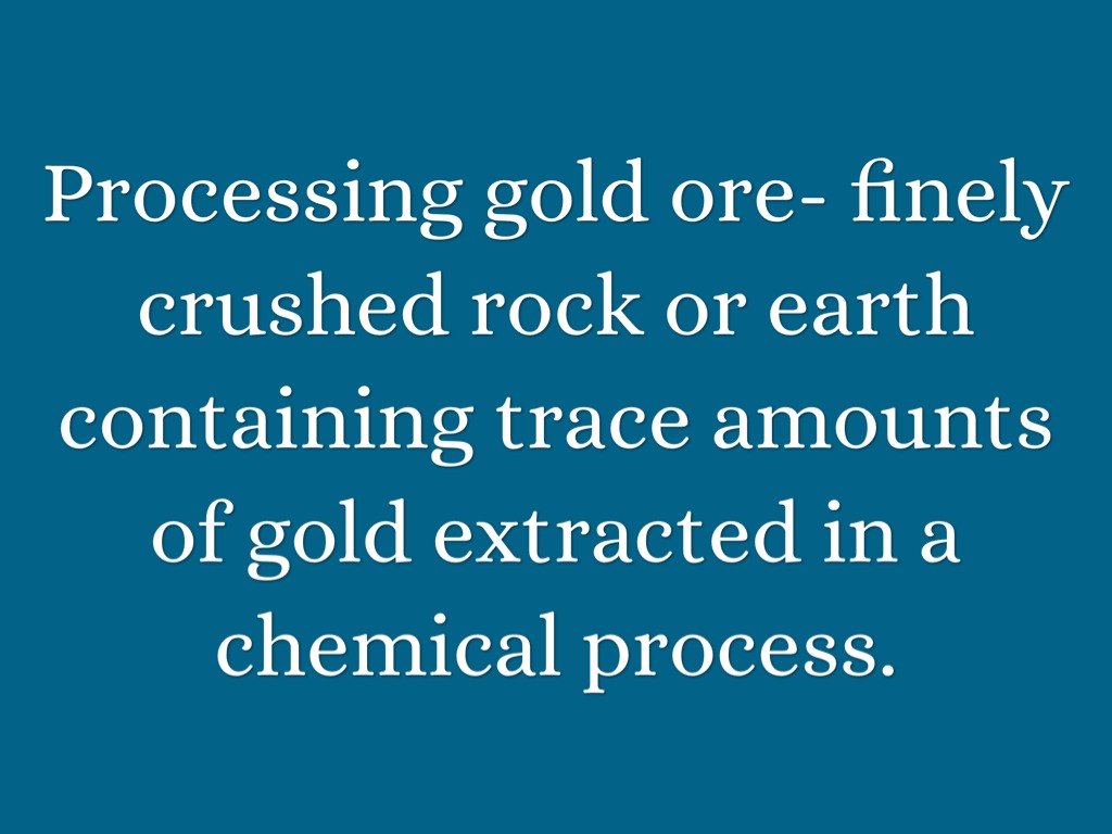 Processing gold ore- finely crushed rock or earth containing trace amounts of gold extracted in a chemical process.
