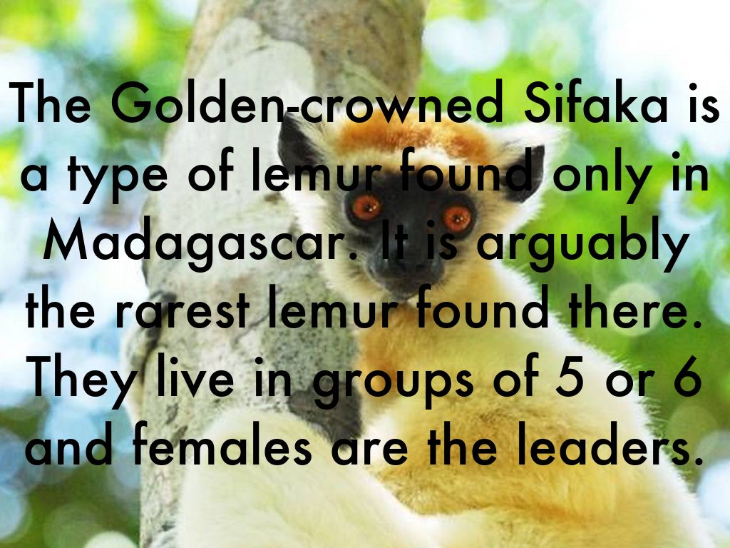 The Golden-crowned Sifaka is a type of lemur found only in Madagascar. It is arguably the rarest lemur found there. They live in groups of 5 or 6 and females are the leaders.