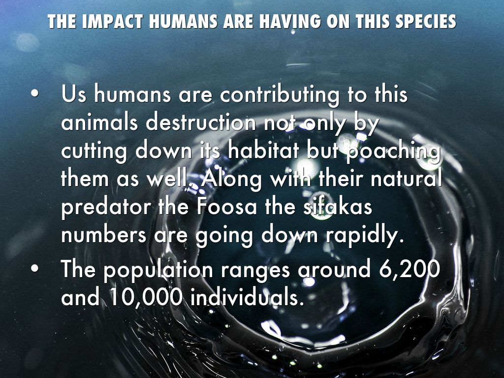 Us humans are contributing to this animals destruction not only by cutting down its habitat but poaching them as well. Along with their natural predator the Foosa the sifakas numbers are going down rapidly.