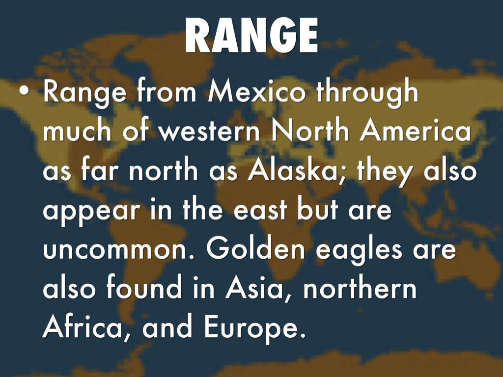 Range from Mexico through much of western North America as far north as Alaska; they also appear in the east but are uncommon. Golden eagles are also found in Asia, northern Africa, and Europe.