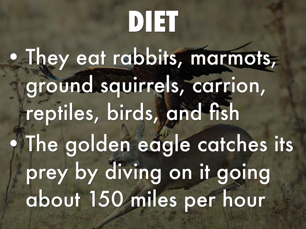 The golden eagle catches its prey by diving on it going about 150 miles per hour