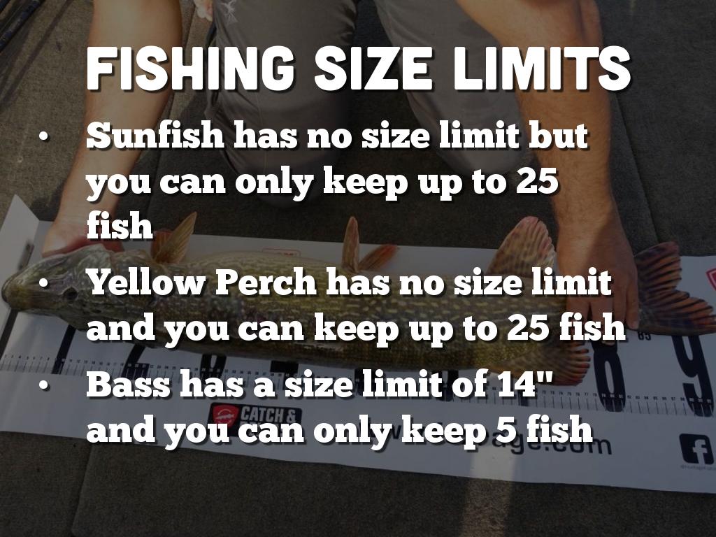 • Sunfish has no size limit but you can only keep up to 25 fish