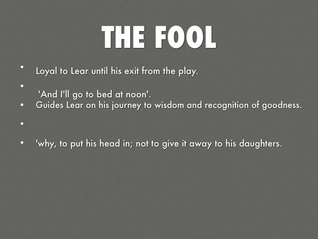 Guides Lear on his journey to wisdom and recognition of goodness.