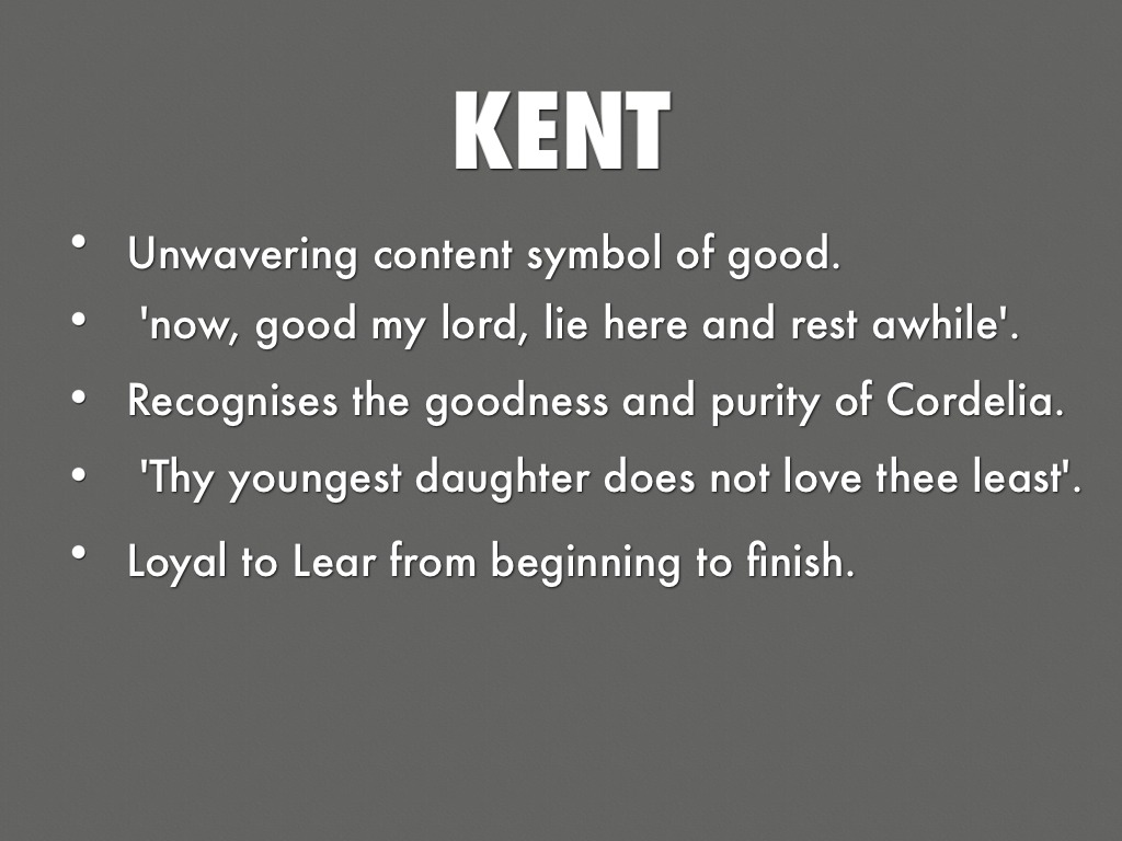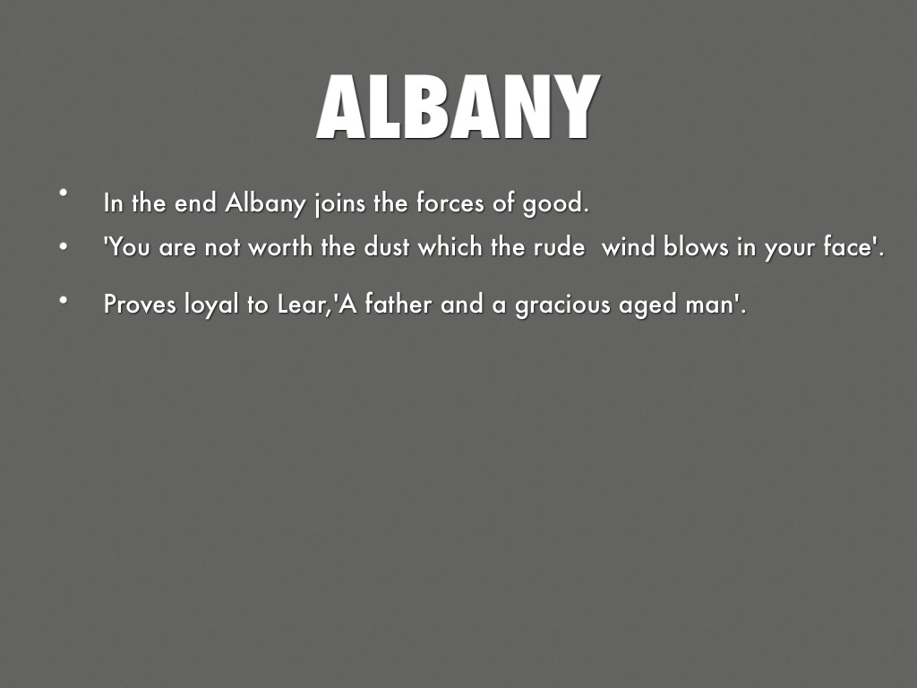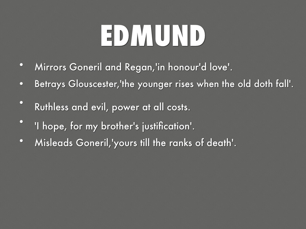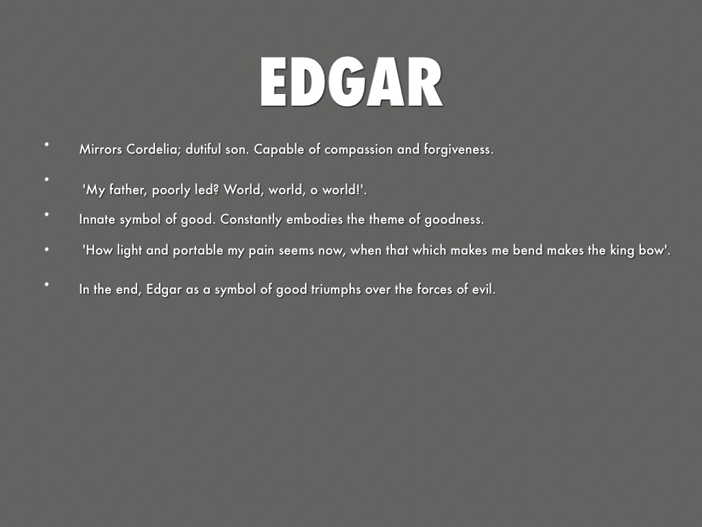 Mirrors Cordelia; dutiful son. Capable of compassion and forgiveness.