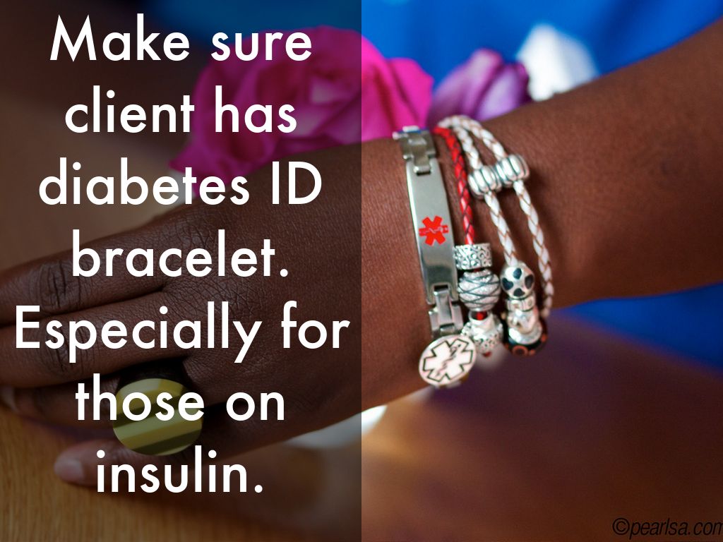 Make sure client has diabetes ID bracelet. Especially for those on insulin.