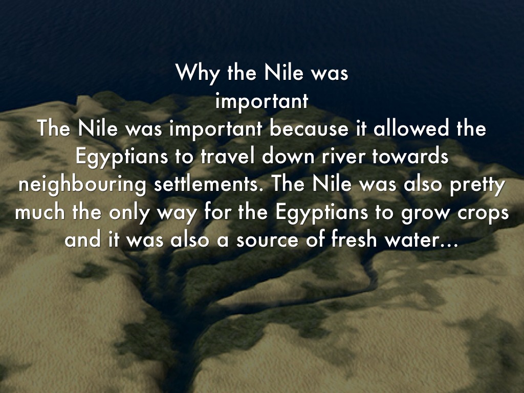 The Nile was important because it allowed the Egyptians to travel down river towards neighbouring settlements. The Nile was also pretty much the only way for the Egyptians to grow crops and it was also a source of fresh water
