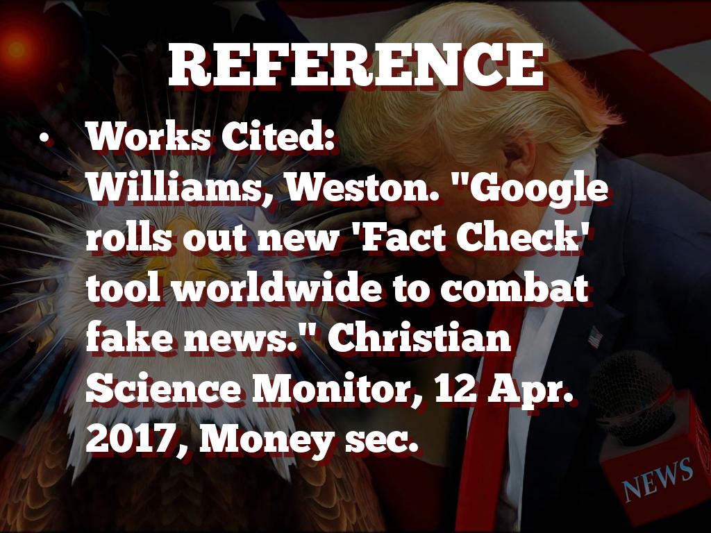 • Works Cited: Williams, Weston. "Google rolls out new 'Fact Check' tool worldwide to combat fake news." Christian Science Monitor, 12 Apr. 2017, Money sec.