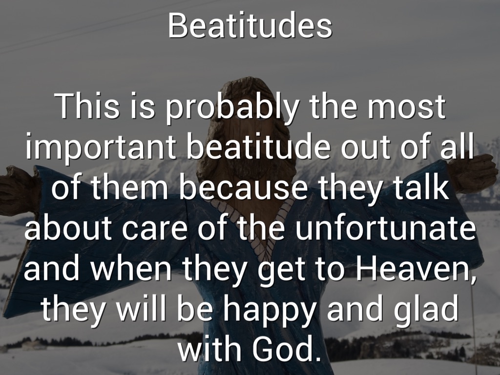 This is probably the most important beatitude out of all of them because they talk about care of the unfortunate and when they get to Heaven, they will be happy and glad with God.