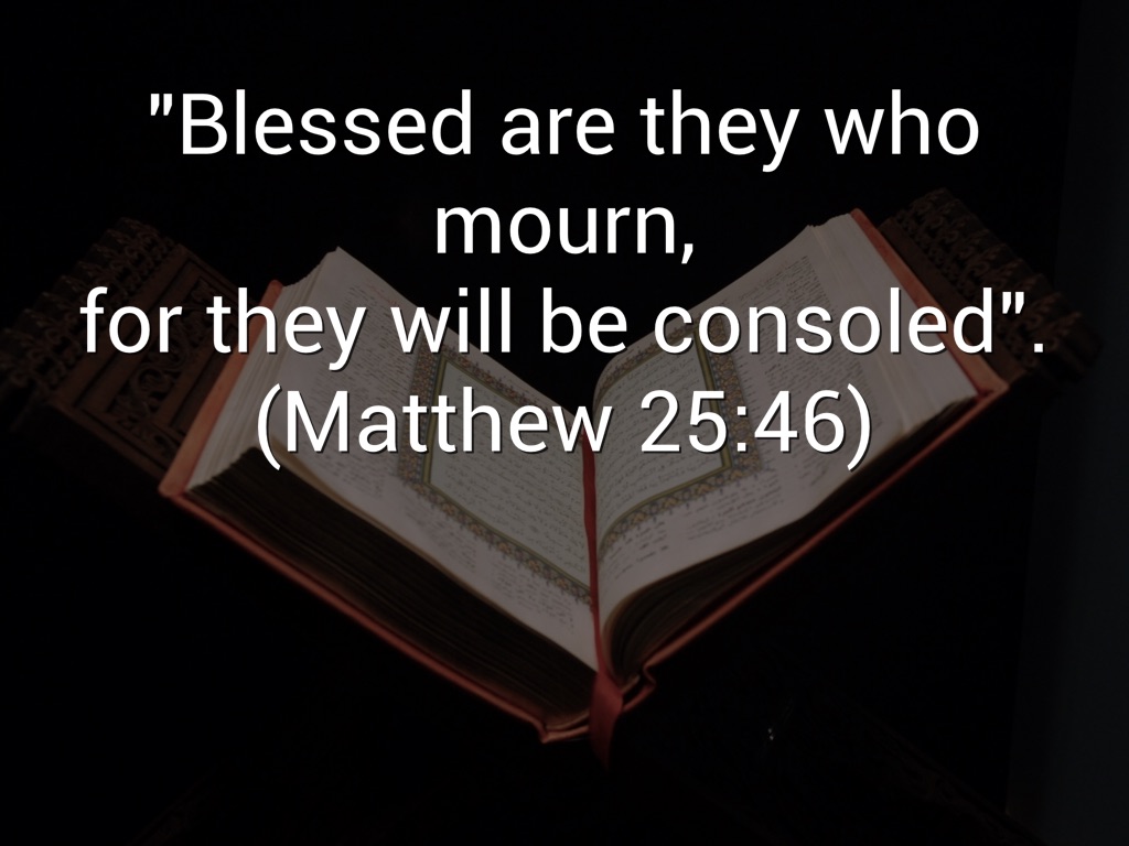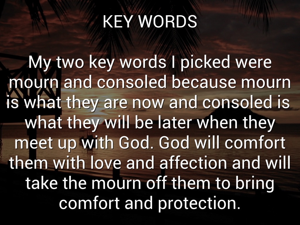 My two key words I picked were mourn and consoled because mourn is what they are now and consoled is what they will be later when they meet up with God. God will comfort them with love and affection and will take the mourn off them to bring comfort and protection.