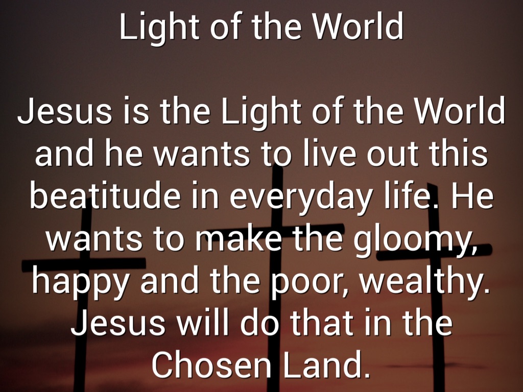 Jesus is the Light of the World and he wants to live out this beatitude in everyday life. He wants to make the gloomy, happy and the poor, wealthy. Jesus will do that in the Chosen Land.