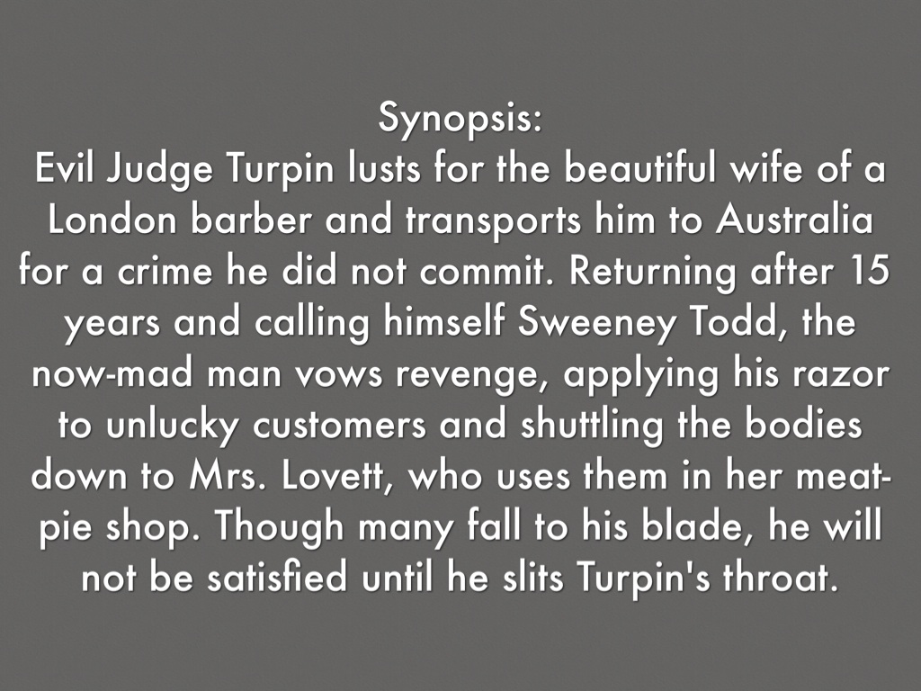 Evil Judge Turpin lusts for the beautiful wife of a London barber and transports him to Australia for a crime he did not commit. Returning after 15 years and calling himself Sweeney Todd, the now-mad man vows revenge, applying his razor to unlucky customers and shuttling the bodies down to Mrs. Lovett, who uses them in her meat-pie shop. Though many fall to his blade, he will not be satisfied until he slits Turpin's throat.