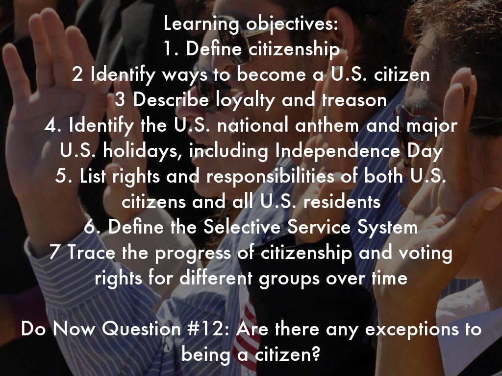 Learning objectives: 1. Define citizenship 2 Identify ways to become a U.S. citizen 3 Describe loyalty and treason 4. Identify the U.S. national anthem and major U.S. holidays, including Independence Day 5. List rights and responsibilities of both U.S. citizens and all U.S. residents 6. Define the Selective Service System 7 Trace the progress of citizenship and voting rights for different groups over time