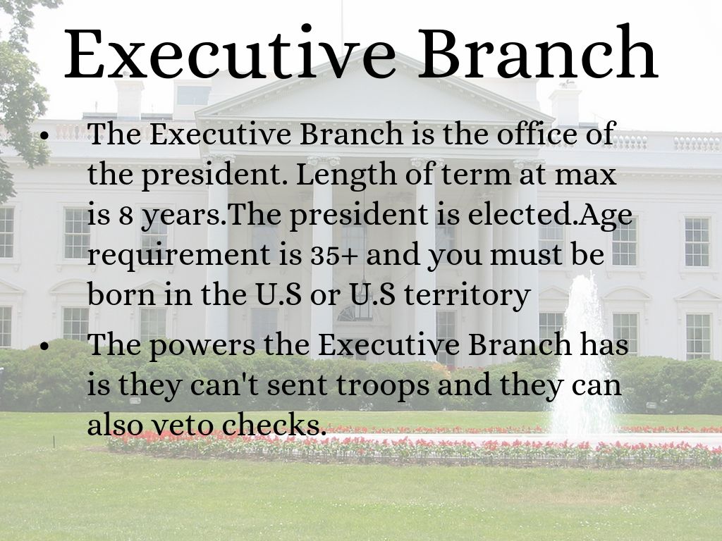 The Executive Branch is the office of the president. Length of term at max is 8 years.The president is elected.Age requirement is 35+ and you must be born in the U.S or U.S territory