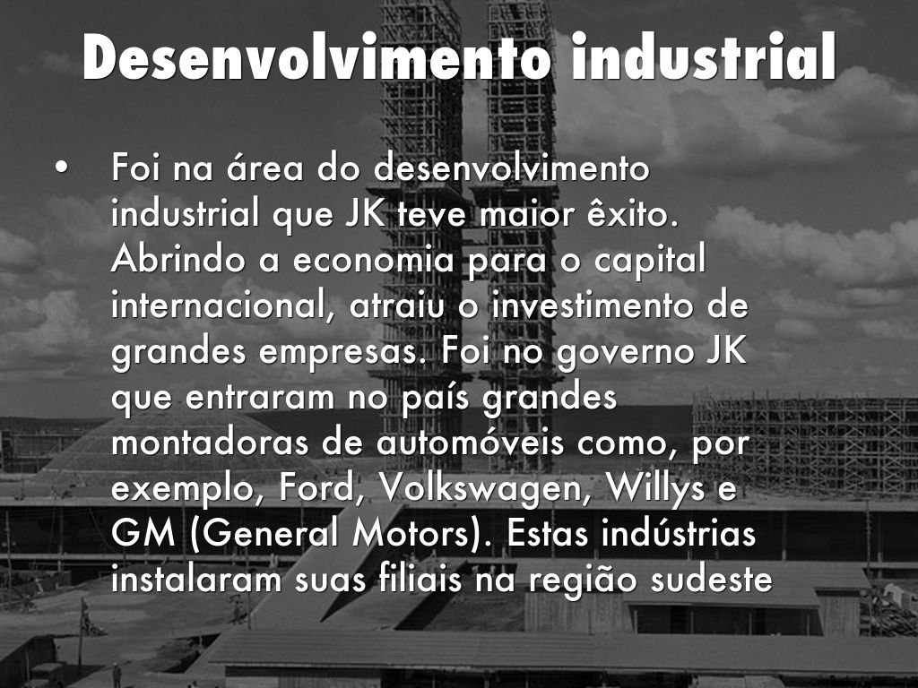 • Foi na área do desenvolvimento industrial que JK teve maior êxito. Abrindo a economia para o capital internacional, atraiu o investimento de grandes empresas. Foi no governo JK que entraram no país grandes montadoras de automóveis como, por exemplo, Ford, Volkswagen, Willys e GM (General Motors). Estas indústrias instalaram suas filiais na região sudeste do Brasil, principalmente, nas cidades de São Paulo, Rio de Janeiro e ABC (Santo André, São Caetano e São Bernardo). As oportunidades de empregos aumentaram muito nesta região, atraindo trabalhadores de todo Brasil. Este fato fez aumentar o êxodo rural (saída do homem do campo para as cidades) e a migração de nordestinos e nortistas de suas regiões para as grandes cidades do Sudeste.