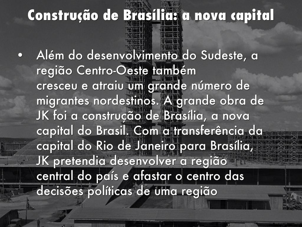 • Além do desenvolvimento do Sudeste, a região Centro-Oeste também cresceu e atraiu um grande número de migrantes nordestinos. A grande obra de JK foi a construção de Brasília, a nova capital do Brasil. Com a transferência da capital do Rio de Janeiro para Brasília, JK pretendia desenvolver a região central do país e afastar o centro das decisões políticas de uma região densamente povoada. Com capital oriundo de empréstimos internacionais, JK conseguiu finalizar e inaugurar Brasília, em 21 de abril de 1960.