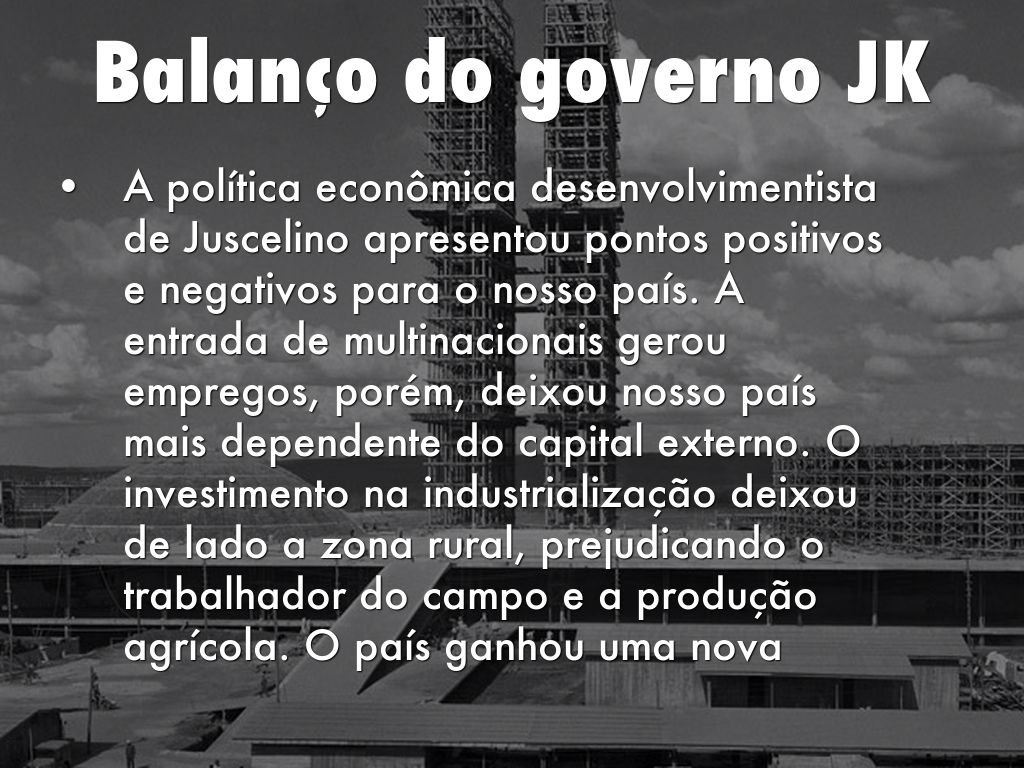 • A política econômica desenvolvimentista de Juscelino apresentou pontos positivos e negativos para o nosso país. A entrada de multinacionais gerou empregos, porém, deixou nosso país mais dependente do capital externo. O investimento na industrialização deixou de lado a zona rural, prejudicando o trabalhador do campo e a produção agrícola. O país ganhou uma nova capital, porém a dívida externa, contraída para esta obra, aumentou significativamente. A migração e o êxodo rural descontrolados fez aumentar a pobreza, a miséria e a violência nas grandes capitais do sudeste do país