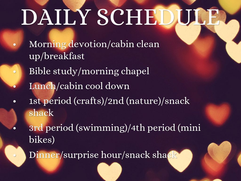Morning devotion was when we read our 2 bible chapters. After that was breakfast and we ate things like bacon, eggs, cereal, cinnamon rolls ect. After breakfast was cabin clean up and we cleaned up our stuff, made the beds, swept under bunks, straightened the shoes, took out the trash and cleaned the bathroom. Then we would have Bible study and one of the counselors would teach my cabin. The oldest boy and girl cabin would be together with the second oldest girl cabin us and then the two youngest boys and girl cabins would be together. They would take a Bible story and teach us a lesson and play a game with it. After that we went to morning chapel where we sang songs, prayed and read the rest of our Bible stories.