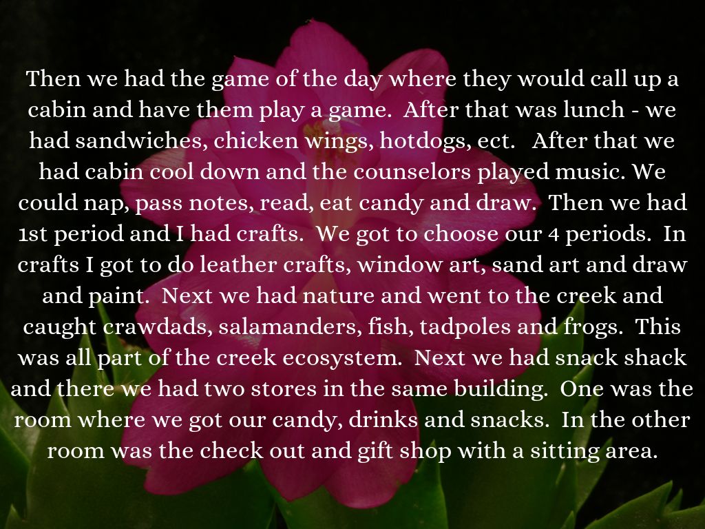 Then we had the game of the day where they would call up a cabin and have them play a game. After that was lunch - we had sandwiches, chicken wings, hotdogs, ect. After that we had cabin cool down and the counselors played music. We could nap, pass notes, read, eat candy and draw. Then we had 1st period and I had crafts. We got to choose our 4 periods. In crafts I got to do leather crafts, window art, sand art and draw and paint. Next we had nature and went to the creek and caught crawdads, salamanders, fish, tadpoles and frogs. This was all part of the creek ecosystem. Next we had snack shack and there we had two stores in the same building. One was the room where we got our candy, drinks and snacks. In the other room was the check out and gift shop with a sitting area.