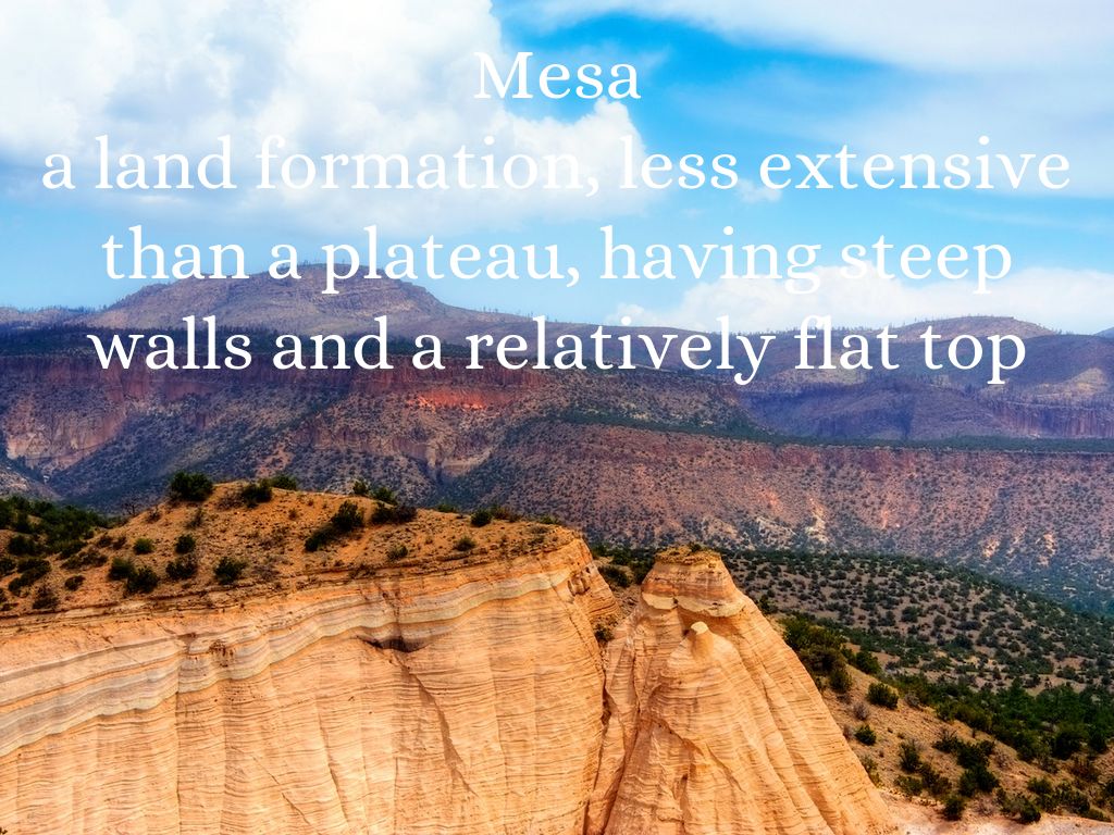 a land formation, less extensive than a plateau, having steep walls and a relatively flat top