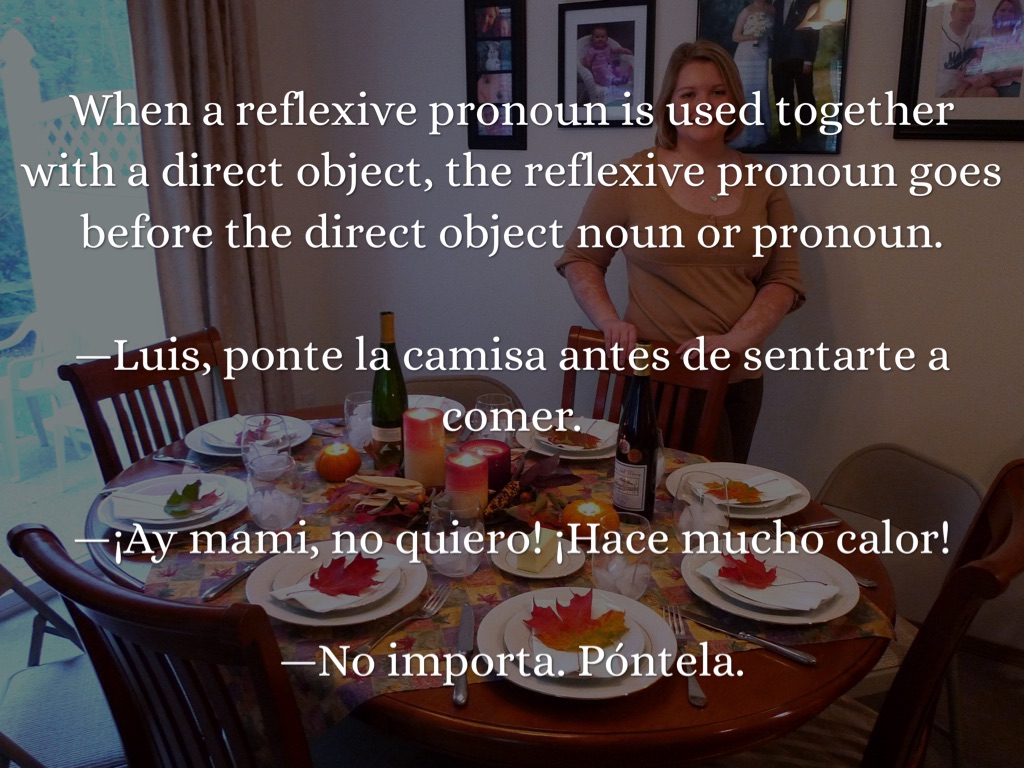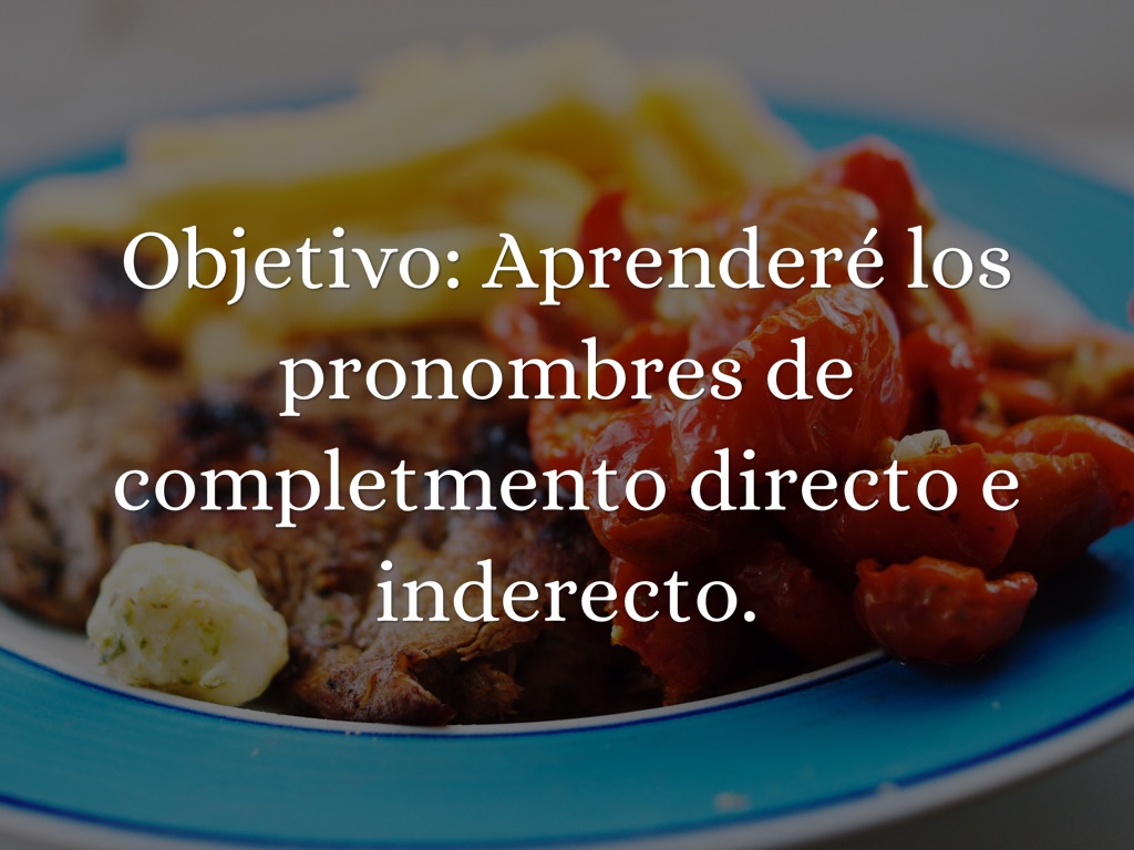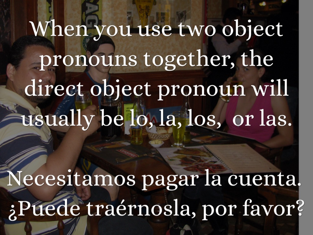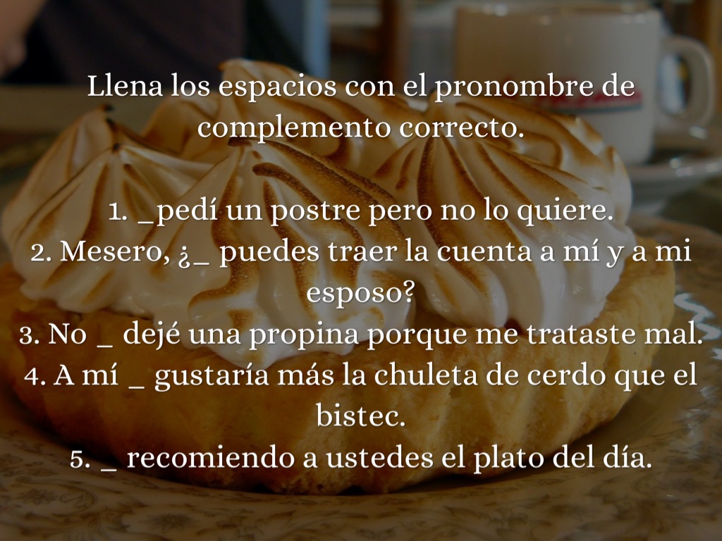 1. _pedí un postre pero no lo quiere. 2. Mesero, ¿_ puedes traer la cuenta a mí y a mi esposo? 3. No _ dejé una propina porque me trataste mal. 4. A mí _ gustaría más la chuleta de cerdo que el bistec. 5. _ recomiendo a ustedes el plato del día.