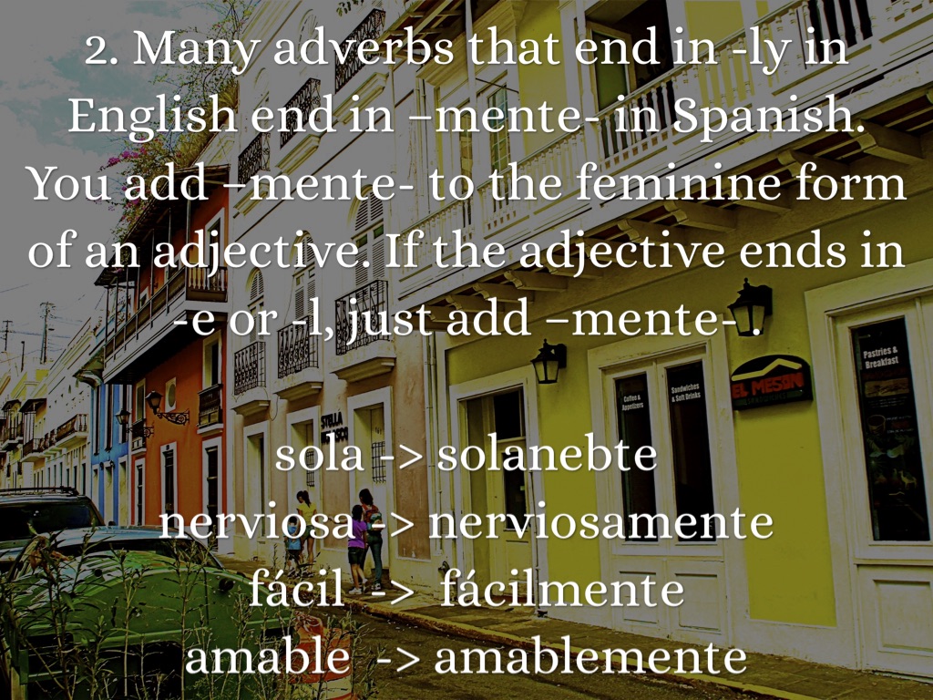 2. Many adverbs that end in -ly in English end in –mente- in Spanish. You add –mente- to the feminine form of an adjective. If the adjective ends in -e or -l, just add –mente- .
