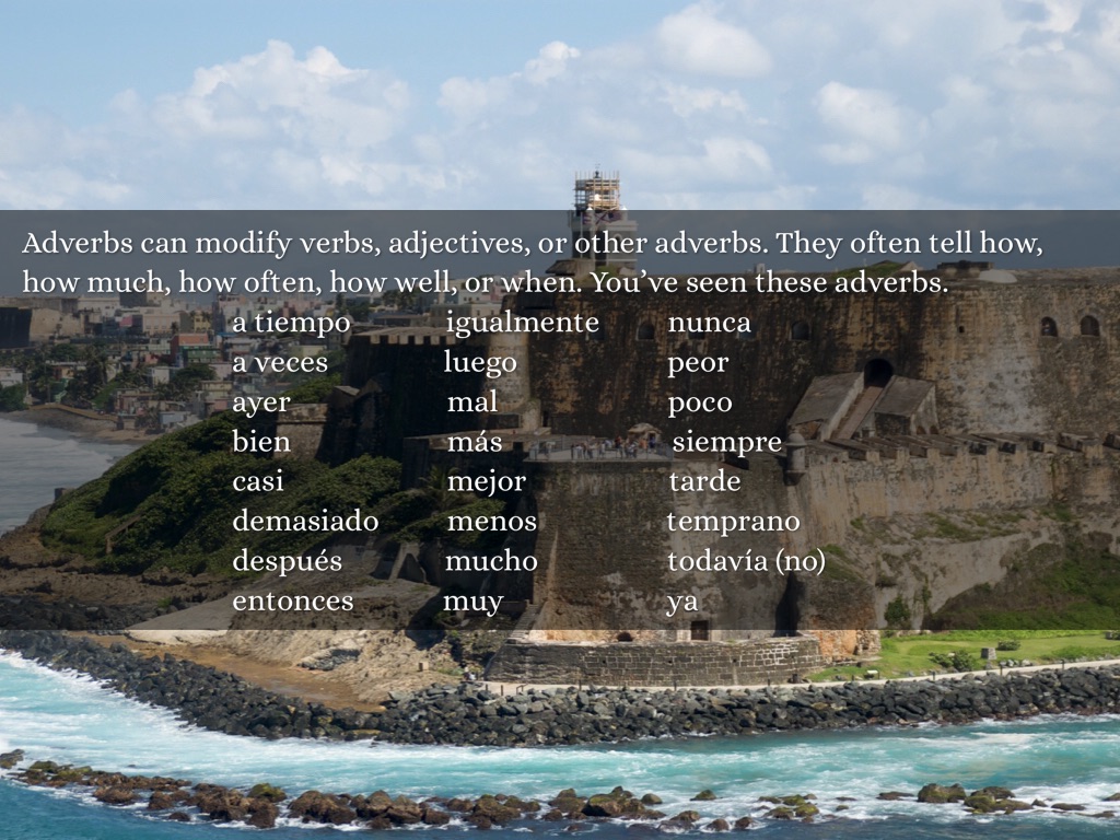 Adverbs can modify verbs, adjectives, or other adverbs. They often tell how, how much, how often, how well, or when. You’ve seen these adverbs. a tiempo igualmente nunca a veces luego peor ayer mal poco bien más siempre casi mejor tarde demasiado menos temprano después mucho todavía (no) entonces muy ya