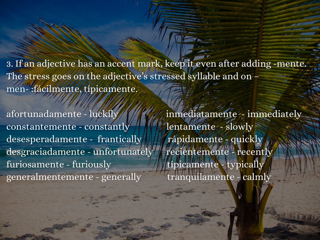 3. If an adjective has an accent mark, keep it even after adding -mente. The stress goes on the adjective’s stressed syllable and on –men- :fácilmente, típicamente.