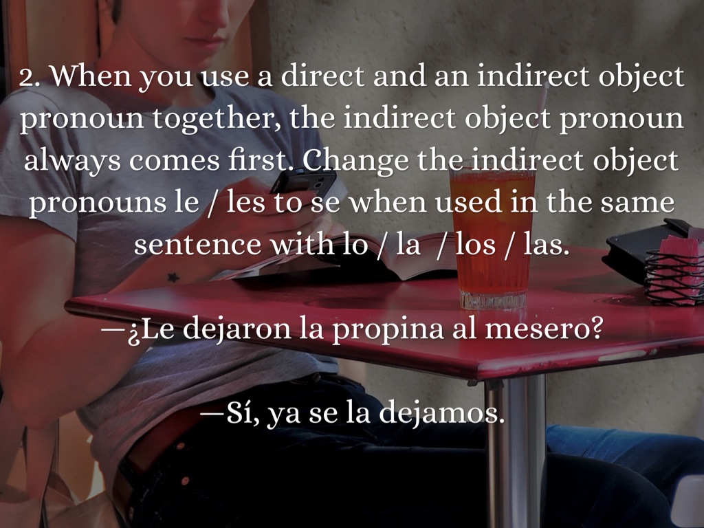 2. When you use a direct and an indirect object pronoun together, the indirect object pronoun always comes first. Change the indirect object pronouns le / les to se when used in the same sentence with lo / la / los / las.