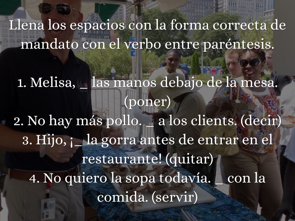 1. Melisa, _ las manos debajo de la mesa. (poner) 2. No hay más pollo. _ a los clients. (decir) 3. Hijo, ¡_ la gorra antes de entrar en el restaurante! (quitar) 4. No quiero la sopa todavía. _ con la comida. (servir)