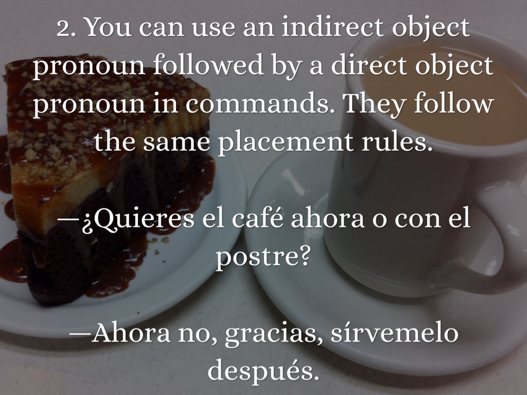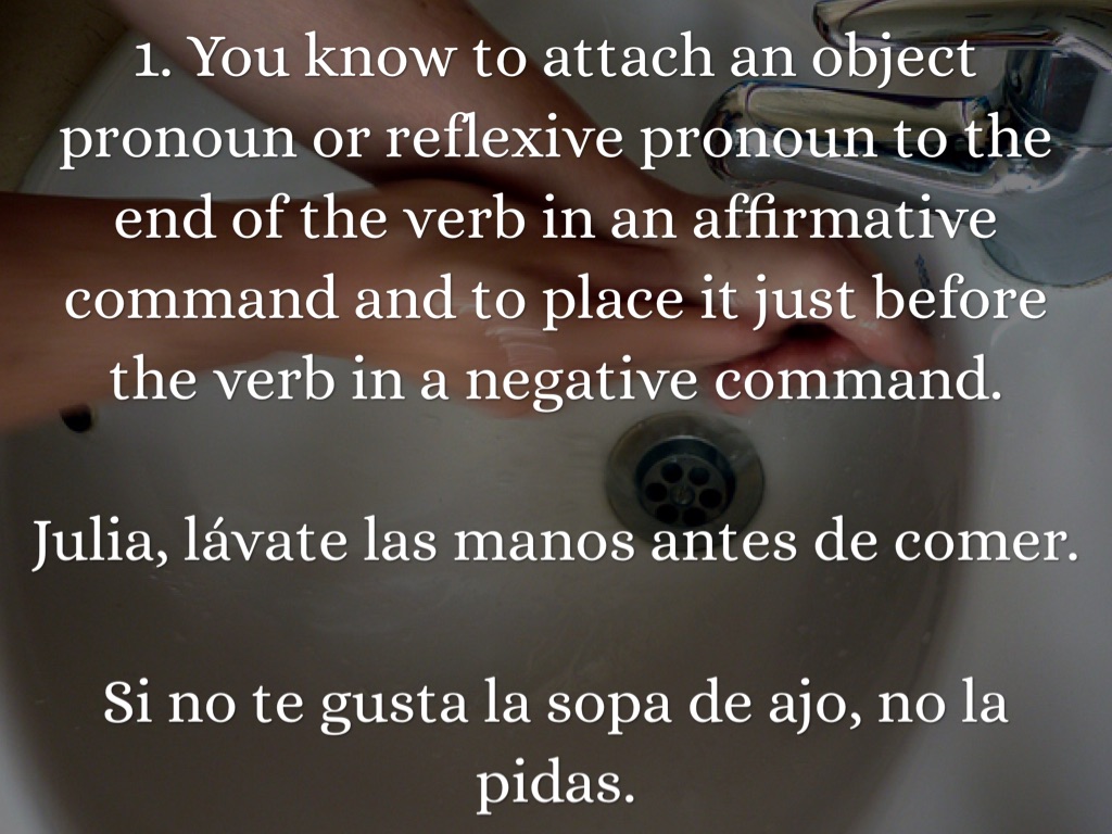 1. You know to attach an object pronoun or reflexive pronoun to the end of the verb in an affirmative command and to place it just before the verb in a negative command.