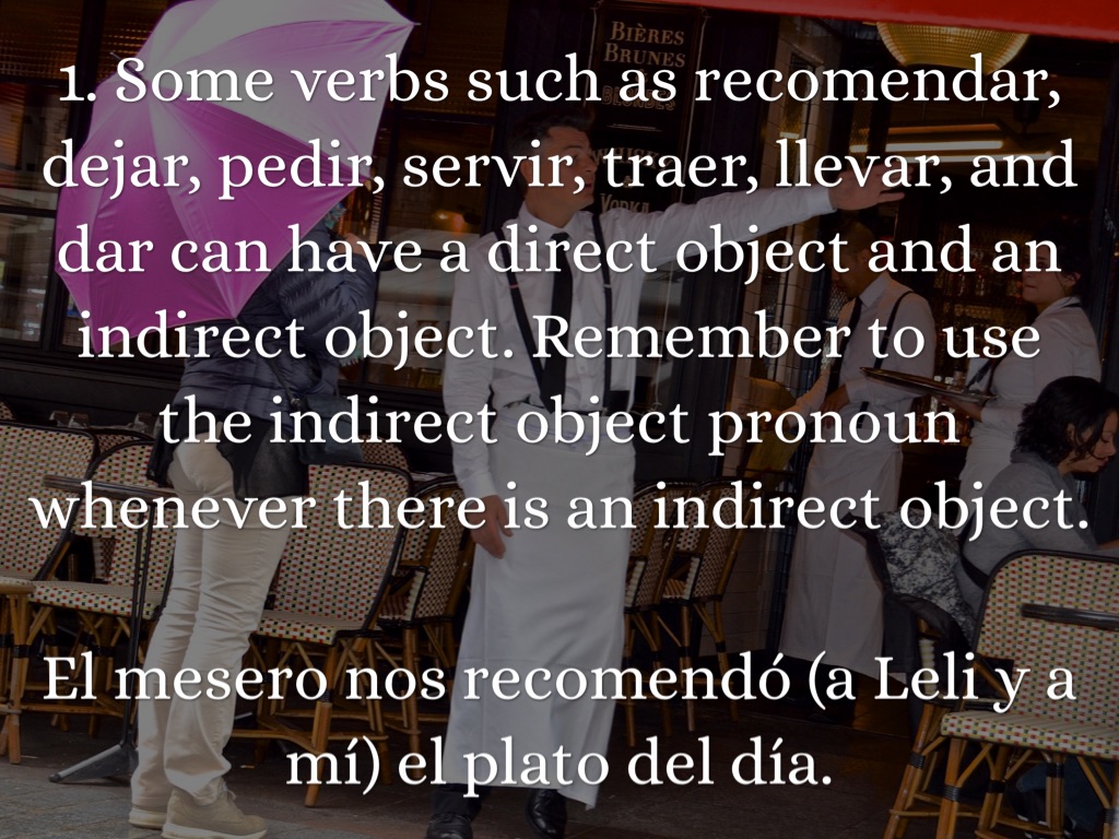 1. Some verbs such as recomendar, dejar, pedir, servir, traer, llevar, and dar can have a direct object and an indirect object. Remember to use the indirect object pronoun whenever there is an indirect object.