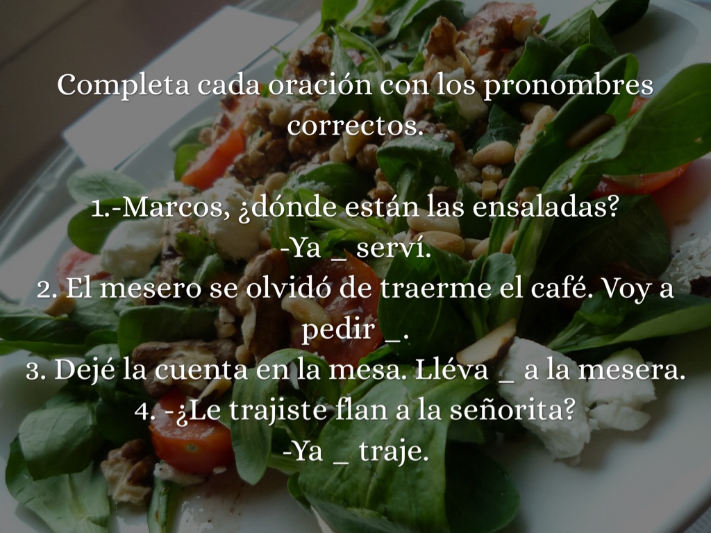 1.-Marcos, ¿dónde están las ensaladas? -Ya _ serví. 2. El mesero se olvidó de traerme el café. Voy a pedir _. 3. Dejé la cuenta en la mesa. Lléva _ a la mesera. 4. -¿Le trajiste flan a la señorita? -Ya _ traje.