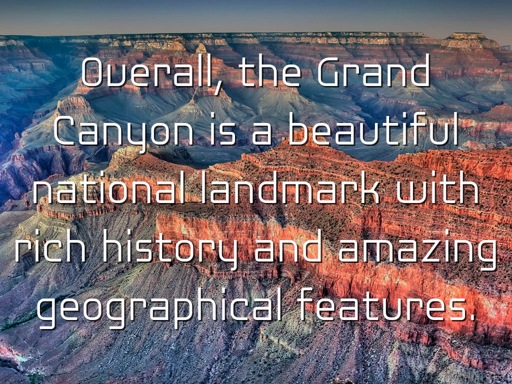 Overall, the Grand Canyon is a beautiful national landmark with rich history and amazing geographical features.