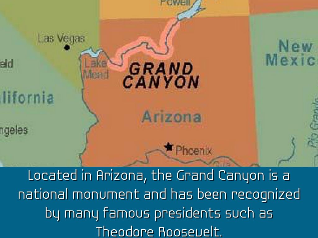 Located in Arizona, the Grand Canyon is a national monument and has been recognized by many famous presidents such as Theodore Roosevelt.
