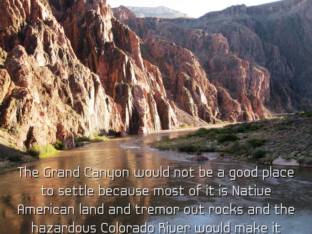 The Grand Canyon would not be a good place to settle because most of it is Native American land and tremor out rocks and the hazardous Colorado River would make it hard to move around.