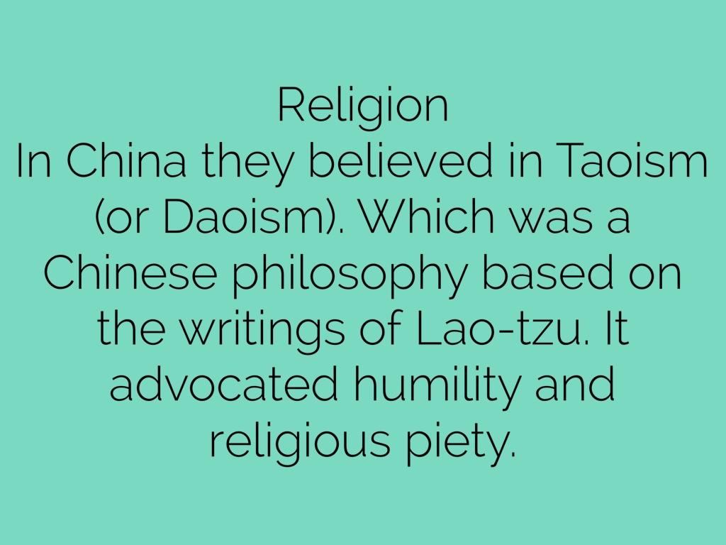In China they believed in Taoism (or Daoism). Which was a Chinese philosophy based on the writings of Lao-tzu. It advocated humility and religious piety.