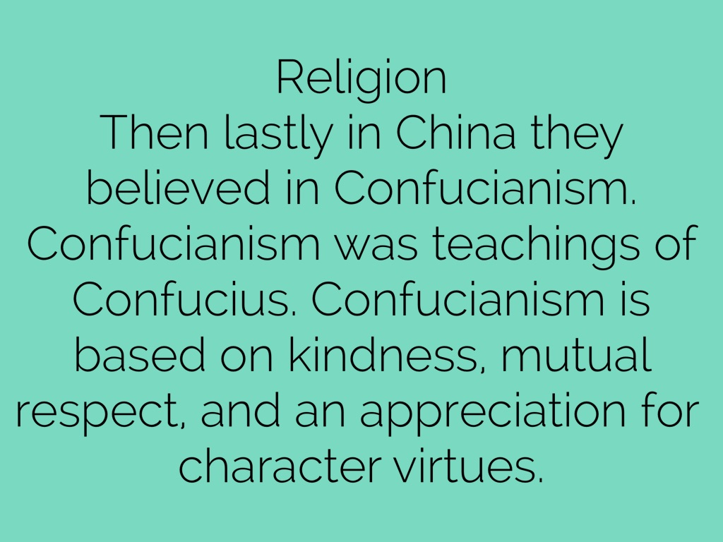 Then lastly in China they believed in Confucianism. Confucianism was teachings of Confucius. Confucianism is based on kindness, mutual respect, and an appreciation for character virtues.