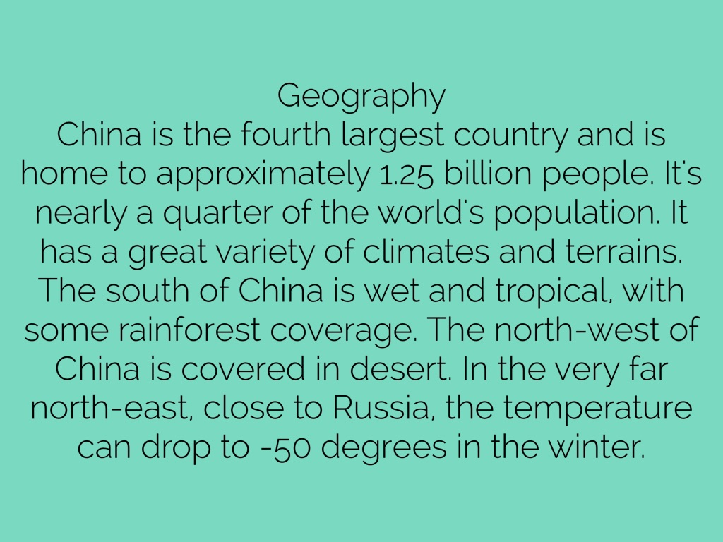 China is the fourth largest country and is home to about 1.25 billion people. That's about less than half the worlds population. It has a great variety of climates and terrains. The south of China is wet and tropical, with some rainforest coverage. The north-west of China is covered in desert. In the very far north-east, close to Russia, the temperature can drop to -50 degrees in the winter.
