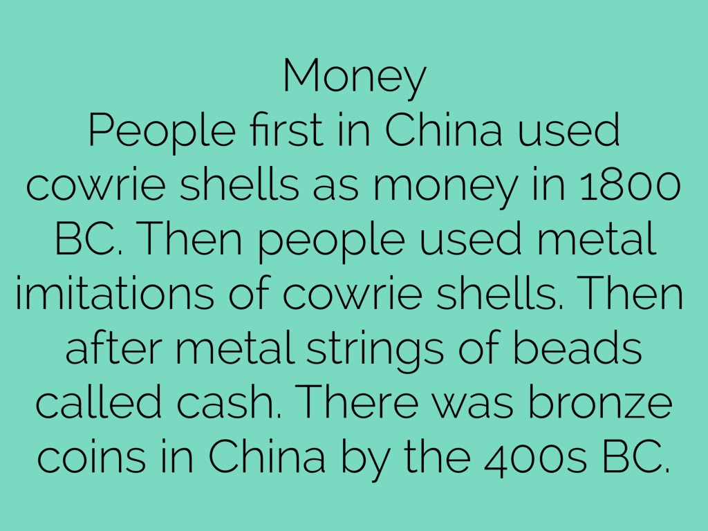 People first in China used cowrie shells as money in 1800 BC. Then people used metal imitations of cowrie shells. Then after metal strings of beads called cash. There was bronze coins in China by the 400s BC.
