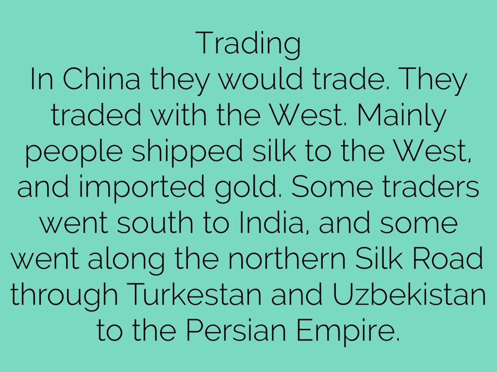 In China they would trade. They traded with the West. Mainly people shipped silk to the West, and imported gold. Some traders went south to India, and some went along the northern Silk Road through Turkestan and Uzbekistan to the Persian Empire.