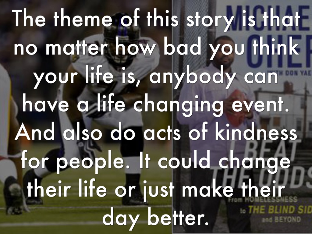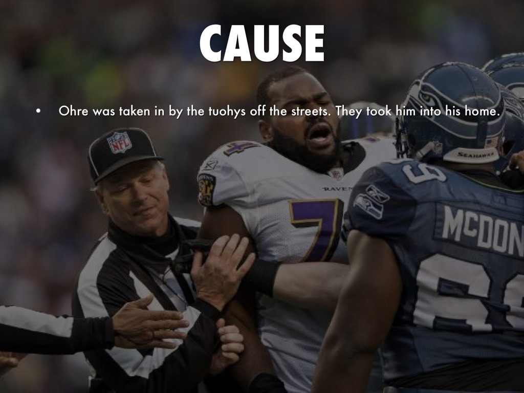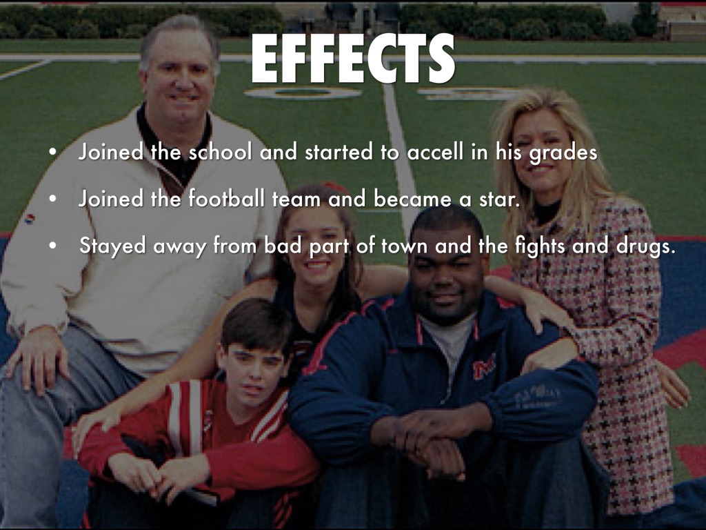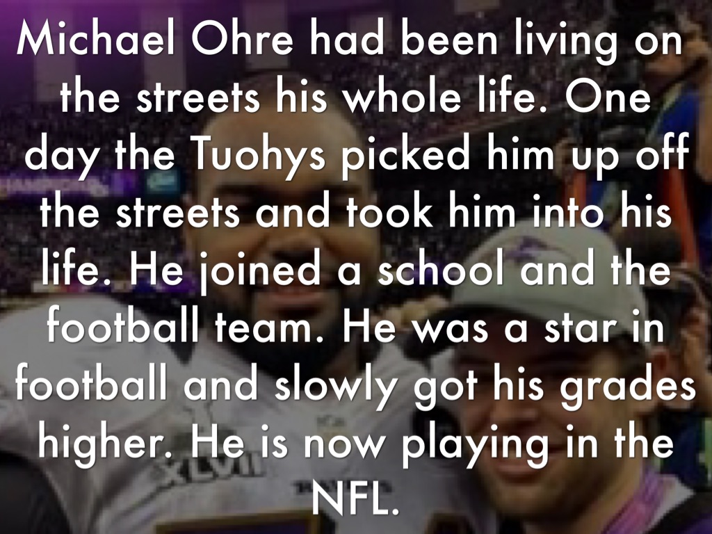 Michael Ohre had been living on the streets his whole life. One day the Tuohys picked him up off the streets and took him into his life. He joined a school and the football team. He was a star in football and slowly got his grades higher. He is now playing in the NFL.