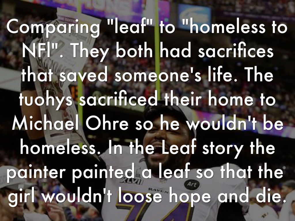 Comparing "leaf" to "homeless to NFl". They both had sacrifices that saved someone's life. The tuohys sacrificed their home to Michael Ohre so he wouldn't be homeless. In the Leaf story the painter painted a leaf so that the girl wouldn't loose hope and die.