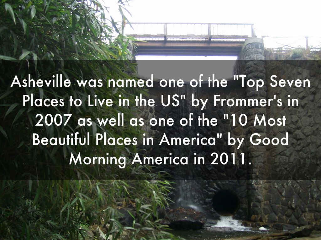 Asheville was named one of the "Top Seven Places to Live in the US" by Frommer's in 2007 as well as one of the "10 Most Beautiful Places in America" by Good Morning America in 2011.