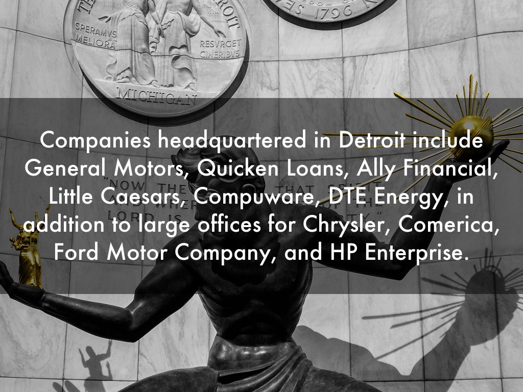 Companies headquartered in Detroit include General Motors, Quicken Loans, Ally Financial, Little Caesars, Compuware, DTE Energy, in addition to large offices for Chrysler, Comerica, Ford Motor Company, and HP Enterprise.