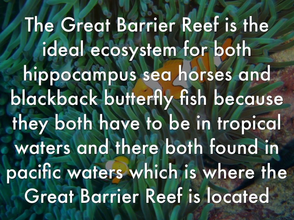 The Great Barrier Reef is the ideal ecosystem for both hippocampus sea horses and blackback butterfly fish because they both have to be in tropical waters and there both found in pacific waters which is where the Great Barrier Reef is located